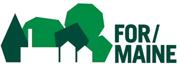 Green graphic with trees, buildings, and the text 'FOR/MAINE'.